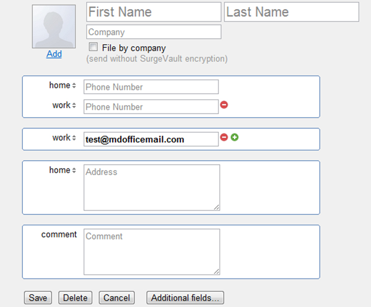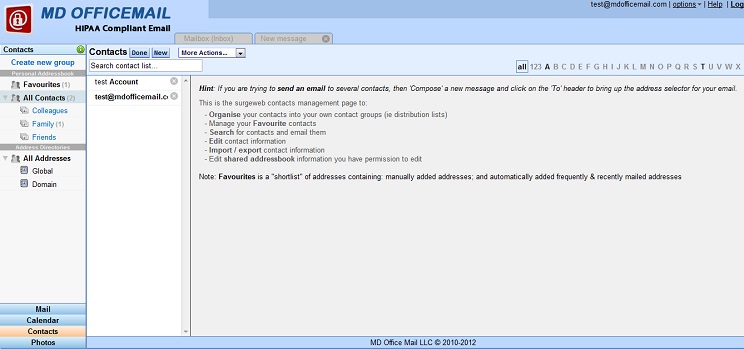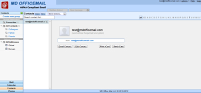 The contacts management page enables more detailed contacts management functions including organizing contacts into groups (aka distribution lists), manually add or remove contact information, and edit contacts providing additional information.