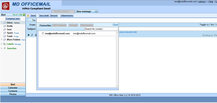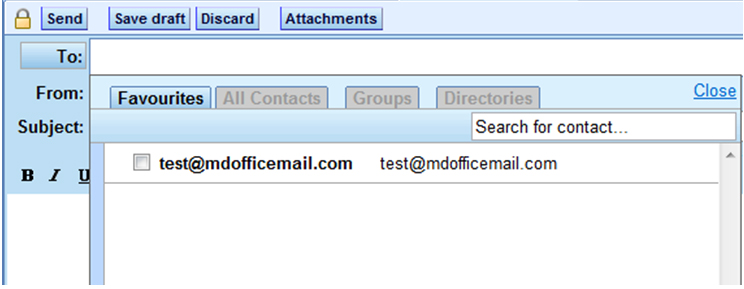 The picker allows quick selection of multiple recipients to your email. Click the To: button, optionally filter by search criteria, and select the addresses you want to add. Once added, contacts can be removed from the recipient list by clicking its small x.