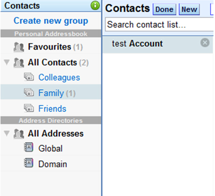 In addition to one's own personal contacts and groups, shared contacts and address books are available. These are listed in the lower half of the left pane on the contacts management page, labeled 'Address Directories'. Contacts within shared address books are indicated by a squared S icon. These might be read-only or editable within the contacts interface depending on permissions enabled for your account. The default Domain directory can be customized to list all mailboxes within your domain as read-only contacts, or it can be configured as a shared address book to do with as you like. Contact the server administrator for more information.