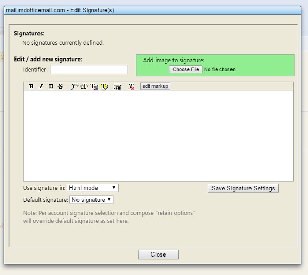 You can add mutiple signature lines to your account and select one of them as default signature. Further, you can have signature in plain text, or html where you can add images like logo etc.