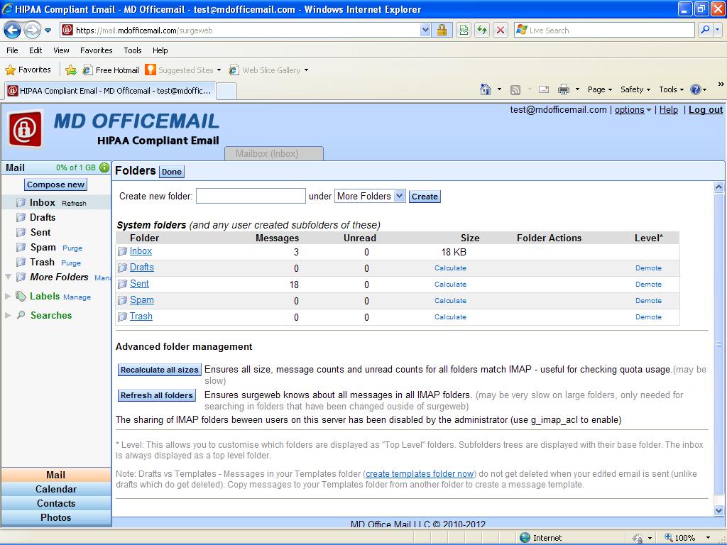 Default Folders - The default folders cannot be renamed or deleted. They are required for mdofficemail secure Webmail to operate.