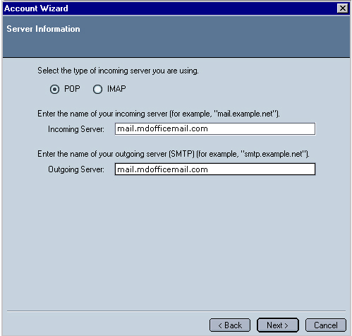 - Type mail.mdofficemail.com in BOTH fields of "Incoming Server"